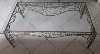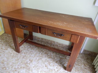 Table en bois avec deux tiroirs à poignées métalliques. La table présente une finition en bois brun et montre des marques sur le dessus. Il s'agit du vernis qui pourra être facilem