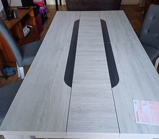 4 chaises en tissus bleu gris table de 180 +64 (rallonge sous la table) sur 90