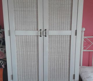 Chambre en bois et rotin blanc: - armoire (H: 190 cm; P: 89 cm; L: 94 cm) - bureau (H: 77 cm; P: 54 cm; L: 85 cm) - table de chevet (H: 46 cm; P: 34 cm; L: 44 cm)