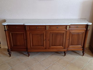 Salle à manger en merisier massif comprenant: - Un buffet en enfilade avec marbre 244 × 100 x 56 - Une table ovale avec rallonges 169 x 104 x 74 - Six chaises tapissées. Le to