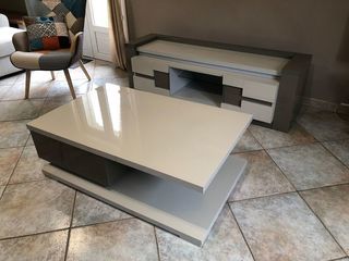 Table de salon en bois composite laqué couleur beige et tiroir couleur taupe longueur 120cm largeur 70cm hauteur 40cm.Meuble tv 1 niche centrale avec tablette en verre et deux nich