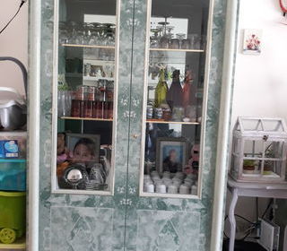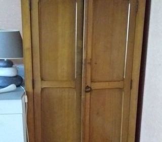 vend une armoire ancienne en très bon état en bois couleur beige foncé une porte un peu déformé mais elle ferme avec 3 étagères de rangement dimensions 1.80 x 1.07 x 48 ne se dé