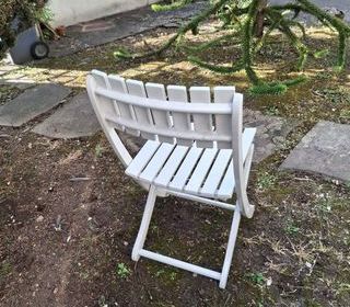 Ensemble de sièges de jardin bois laqué blanc : 2 x Chaises pliantes 2 x Fauteuils pliants et réglables Avec coussins En bon état, conservés à l'abri.