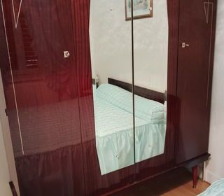 chambre à coucher comprennt Armoire brun foncé avec miroirs. 2 portes avec une finition en vernis brillant. 1 côté penderie - 1 côté étagère Il y a 1 chevet et 1 lit 140 x 190