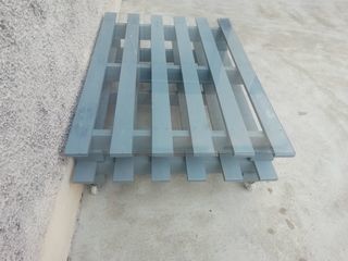 Table basse en palette peinte et dessus verre, roulettes avec freins.... Je la vend car déménager et pas de place... A mettre sous terrasse pour apero avec transats.... 30 eur