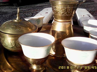 Service à thé - café originaire d'Afrique du Nord en cuivre doré . Il date de 1950 -1955. Il est composé de : - un plateau de 32 cm de diamètre - une cafetière de 18 cm de haut -