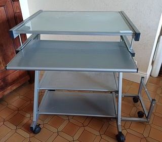 Bureau pour poser l' ordinateur, l'unité centrale , le clavier En métal et en verre Dimensions : Longueur : 63 cm Largeur : 53 cm Hauteur : 78 cm Très bon état