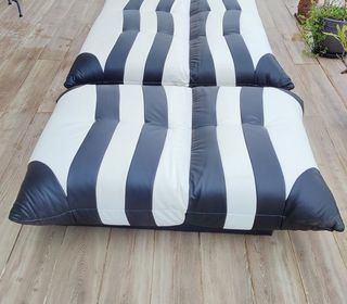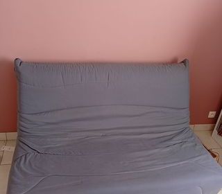 CLIC-CLAC en bon état confortable 2 places. Gris et noir qqes taches qui ont été nettoyées mais ne sont pas parties :( sur le matelas malgré une alaise... Deux coussins accoudoi