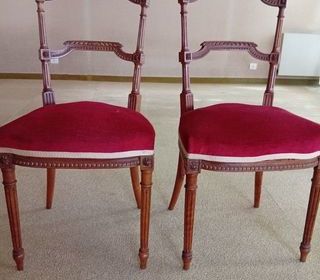 Vends un lot de 2 chaises en bois et velours rouge, très joliment sculptées. Assise très confortable. Hauteur des chaises : 85 cm Hauteur de l'assise : 45 cm. A voir et à récu