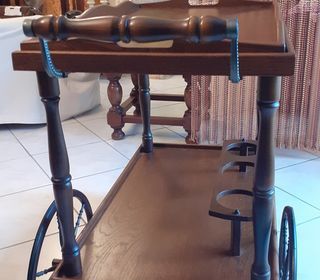 Desserte en bois sur roues avec espace de rangement inférieur. De couleur brun foncé, équipée de deux roues métalliques et d?une poignée supérieure pour faciliter le déplacement. C