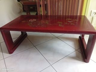 Vends une table basse en bois laqué et filets dorés, décorations style asiatique. Dimensions : longueur 78cm largeur 40 cm hauteur 30cm. A voir et à récupérer sur place à Montau