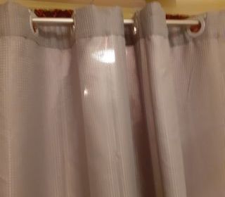 Vends rideau de douche 180 x 200 cm de hauteur, 100% polyester avec anneaux intégrés, couleur gris clair. La tringle est en aluminium extensible 120 à 220 cm. Acheté le 07/03/2019