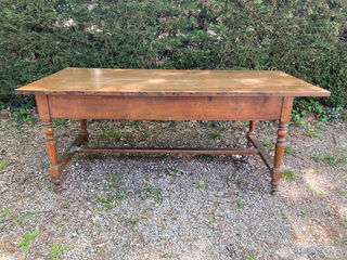 Table de ferme en chêne massif et plateau en peuplier : 189,5 x 86,5 cm , h 78 cm . A récupérer sur place. La table est avec un petit tiroir et un grand tiroir et est bien entret