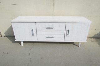 Meuble en bois massif Volontairement vieilli, aspect brut blanchi cérusé pour un rendu " palette", façon indus , Pieds compas, 2 tiroirs , Etagères réglables.
