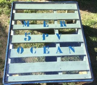 Table basse en bois sur roulettes avec plateau en verre Table avec plateau en verre impeccable, en très bon état Table décor marin Dimensions : Longueur 95cm - largeur :