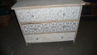 Structure, panneaux de côtés, du dessus, du dessous, façades et structure des tiroirs : manguier massif Panneau du fond et fond des tiroirs : panneaux de fibres de moyenne densité