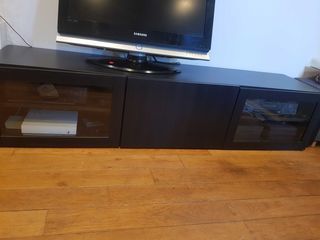 Meuble TV Ikea noir Dimensions: longueur 180cm x profondeur 42cm x hauteur 38cm. Il y a 3 compartiments de rangement, système d'ouverture poussoir/pression, dont 2 sont vitrées. Da