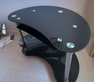 Vends table en verre, teintée noire. 3 plateaux dont un coulissant. Peinture s'en va, par endroit. Contacter SVP