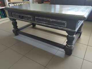 Vends table basse en bois massif de couleur grise avec liserés blancs, munis de deux tiroirs intercalaires de grande taille, logés sous le plateau. Hauteur : 50 cm Longueur : 120