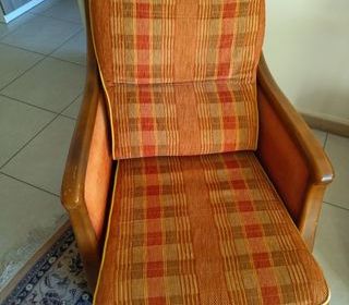 Fauteuil avec assise extensible. Accoudoir et pieds bois merisier, tissu rayé ton orangé. Dimension : Profondeur = 83 cm (position normal) et 1m30 (position allongée) Largeur = 7