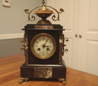 1 horloge ancienne de meuble en marbre et cuivre jaune (mécanisme à clef)