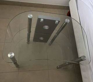 Meuble HI-FI télé en verre et métal comme neuf. Trois étagères de forme arrondie pour chaîne hi-fi, décodeur, lecteur de DVD et télévision, avec espaces à l'arrière pour passer les