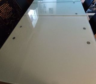Extension automatique. Dimension fermée 90 X 165 - ouverte 90 X 210 Épaisseur du plateau en verre 12 mm Structure en aluminium anodisé et chaises assorties 280 € négociable