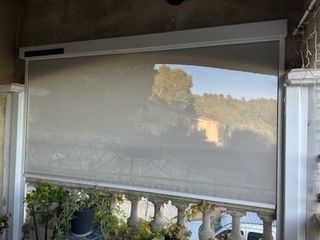 Store enrouleur intérieur couleur claire, installé sur une terrasse avec mécanisme visible en haut. Très bon état. Idéal pour limiter l'intensité lumineuse motorisation avec panne