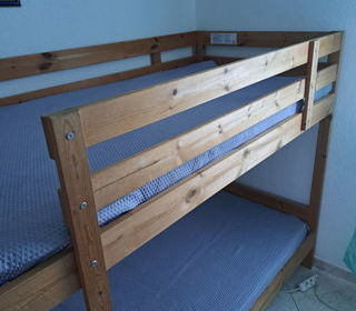 lits superposés en bois bon état vendu avec matelas et draps housses, dessus de lit gris, ainsi que quelques draps