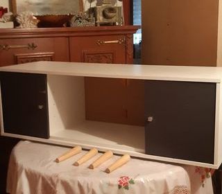 Meuble support de télévision, blanc. Espace central de 55 cm - 2 emplacements aux extrémités ,de 30 cm, fermés par 2 portes de couleur noire. Longueur 115 cm - hauteur 40 cm + 16 c