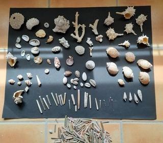 Autour de 60 coquillages, coraux, coquilles d'oursins ou autres collectés à la Réunion. Les oursins crayons ont été vendus. La règle sur la deuxième photo mesure 30 cm et vous do