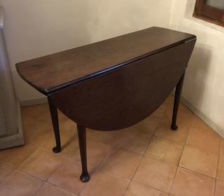 Table ancienne en acajou massif. Se plie des deux côtés. Longueur/diamètre: 1,15 mètre