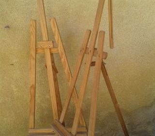 les deux chevalets sont en bois clair, de 177 cm de hauteur sur 65,5 cm de largeur aux pieds, ajustables en hauteur, avec une fixation en haut à l'un d'eux. Pourraient convenir dan