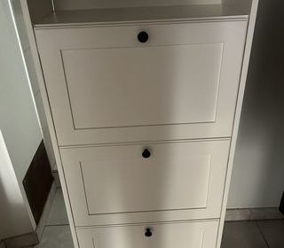 Meuble blanc à chaussures, trois tiroirs plus étagères un. 25 en hauteur profondeur 30 largeur 60.