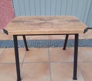 MODÈLE UNIQUE & SIGNÉ. Table basse ou bout de canapé, fabriquée à partir d'un piétement de chaise en métal des années 2000 et d'un plateau en ronce de noyer d'époque Art déco, rest