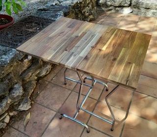 Ancienne table en formica, très pratique, car pliante et adaptée à des petits espaces (studio, balcon...), pieds en chrome nickel et plateau en formica remplacé par un plateau en a