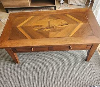 Bonjour Originale table de salon en bois massif Le bois est du châtaignier Les pieds sont en marqueterie dimension diamètre 85 hauteur 45