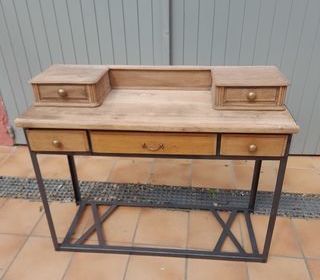 MODÈLE UNIQUE & SIGNÉ. Console en chêne et noyer massifs, composée d'une partie de coiffeuse 1900, les 2 tiroirs en noyer massif du dessus, d'un plateau en chêne massif, de 3 tiroi