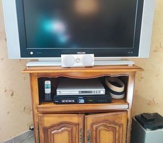 Vends table d'appoint en bois et métal avec 2 tabourets et des étagères pour le rangement. Permet de faire une séparation. Tres pratique. Dimensions L 120 cm x longueur 40 cm x H 7