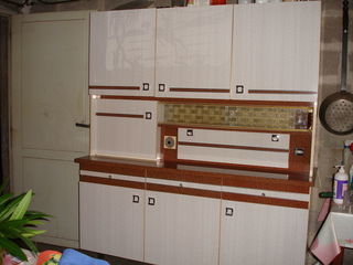A vendre buffet en formica en 2 parties des années 70/75. Le bas composé de 3 portes et 3 tiroirs Le haut composé de 4 portes, une partie vitrée coulissante et une partie pleine