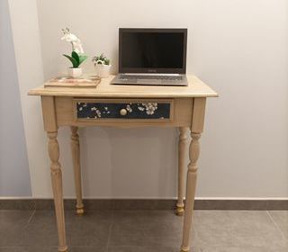 Vend meuble unique, ancien meuble relooké, petit bureau, table d'appoint ou posé dans une entrée 125€. Élégant avec sa couleur bois naturel, ses chaussettes dorées, et son tiroir