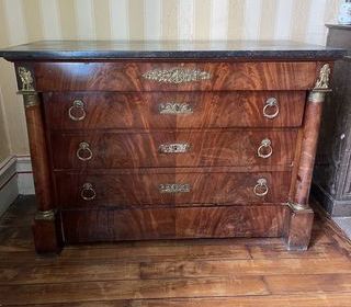 Commode empire a colonnes détachées. Placage d'acajou flammé sur fond de chêne avec bronze ; Façade a quatre tiroirs. Anciennes restaurations. Dessus en plateau de marbre noir