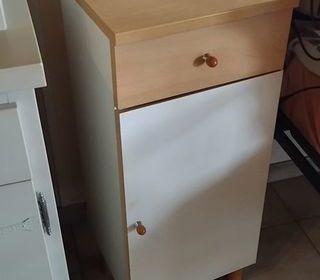 Meuble blanc et marron, 35 X 84, profondeur 32 cm Je vends, car je dois vider la maison de ma maman qui part en maison de retraite. Paiement uniquement en liquide Pas de l