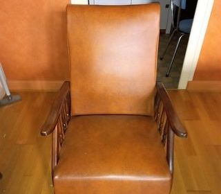 Fauteuil simili cuir marron en très bon état // accoudoirs et pieds bois