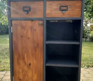 Issue d'un ancien (1960) petit restaurant de la campagne berrichonne, elle permettait de ranger les couverts et serviettes. Elle est en pin, réparée, restaurée, traitée. Elle a di