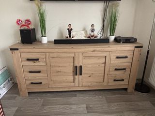buffet en bois clair de 2021, avec six tiroirs de chaque côté, et porte centrale, de taille 43 cm de profondeur et 1m96 de longueur, en parfait état. à venir voir rapidement, cause