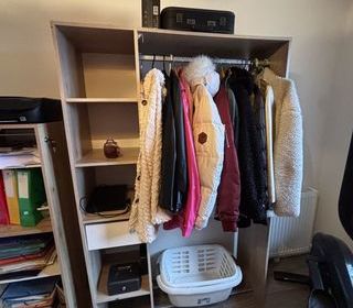 vends penderie avec un tiroir, et 4 étagères, idéale, pour une entrée, ou une chambre, ou pour dans une dressing; très bon état, faire offre et venir la chercher si ça vous intér