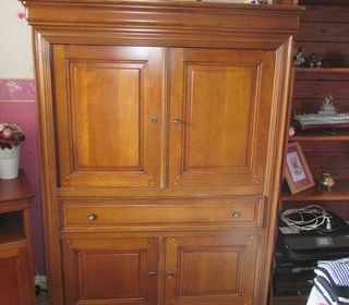 meuble tv hauteur 1.74 cm largeur 1.20m profondeur 54cm avec 2 portes supérieur et plateau tournant et 2portes basses de rangement le tout en parfait état en chêne massif