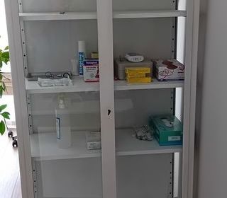 Armoire métallique blanche avec portes vitrées. Idéale pour le rangement de fournitures médicales, de documents ou d'objets divers. Comprend quatre étagères réglables en hauteur.