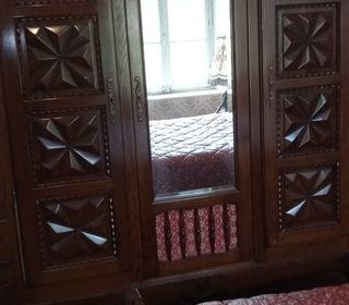 Chambre style basque en bois massif composée : 1 lit 140 /200 1 armoire (170 large/190 haut) 3 compartiment étagères à l'intérieur. 1 chevet (63 large/ 50 haut) Elle a été t